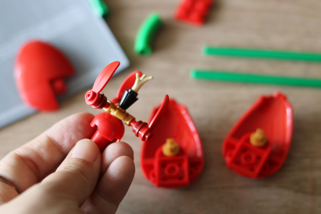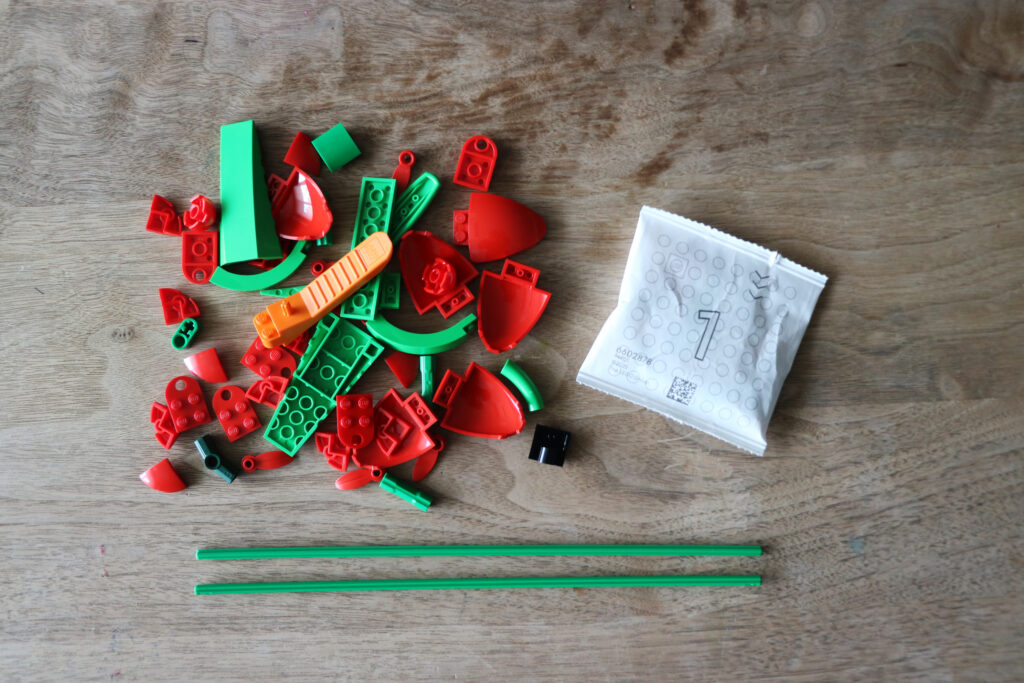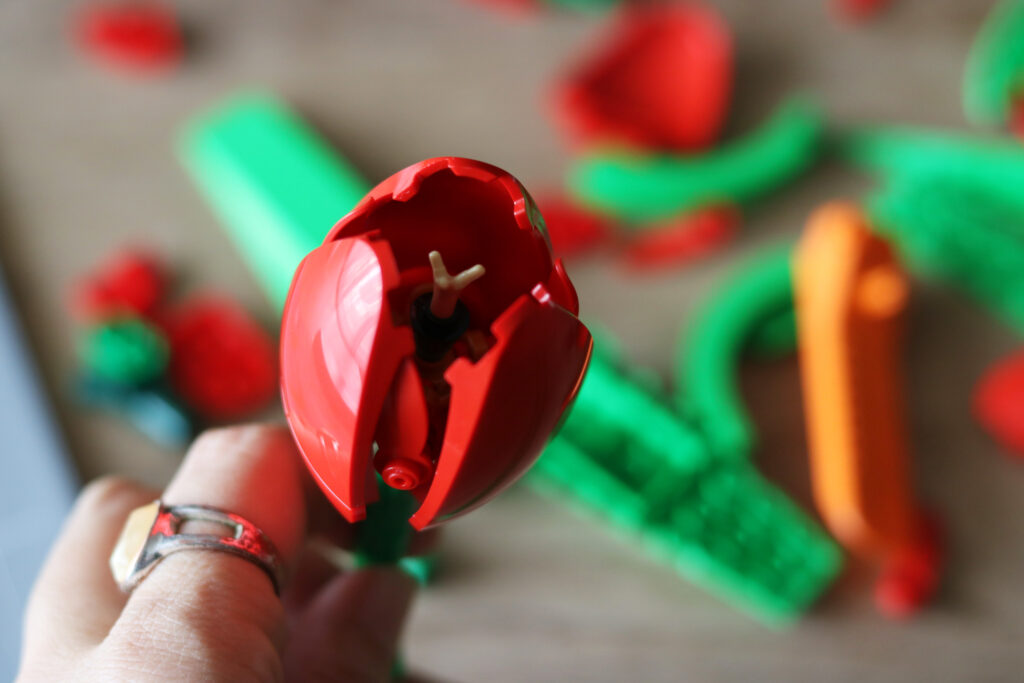お花のパーツは細かい部分まで一つ一つ丁寧に作られていて、めしべのパーツがあったり、花びらも大きいのと小さいのがあったり。子供がいつも遊んでいる真四角のレゴ®️ブロックとは違う有機的なパーツが多くて「何これすごい!」と終始感動しながら制作を進めました。