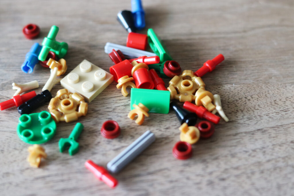 組み立て説明書に従いまず「1」と書かれた袋をピリピリと破きます。色とりどりのレゴ®️ブロックが姿を表し、中にはまた「1」の小袋が。レゴ®️ブロックって、とにかくただただかわいい!ですよね。なぜだろう、不思議。多分作る時のワクワク感がこの形状と合わせて脳にインプットされてるんだと思う。うん、きっとそうに違いない。