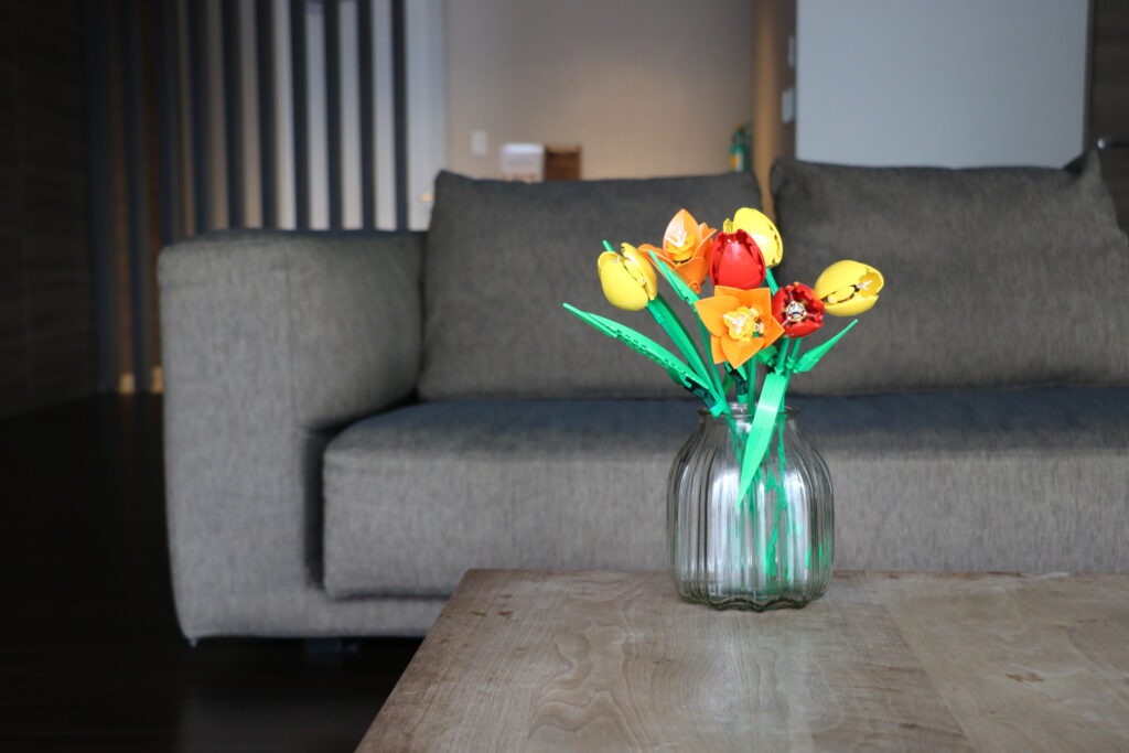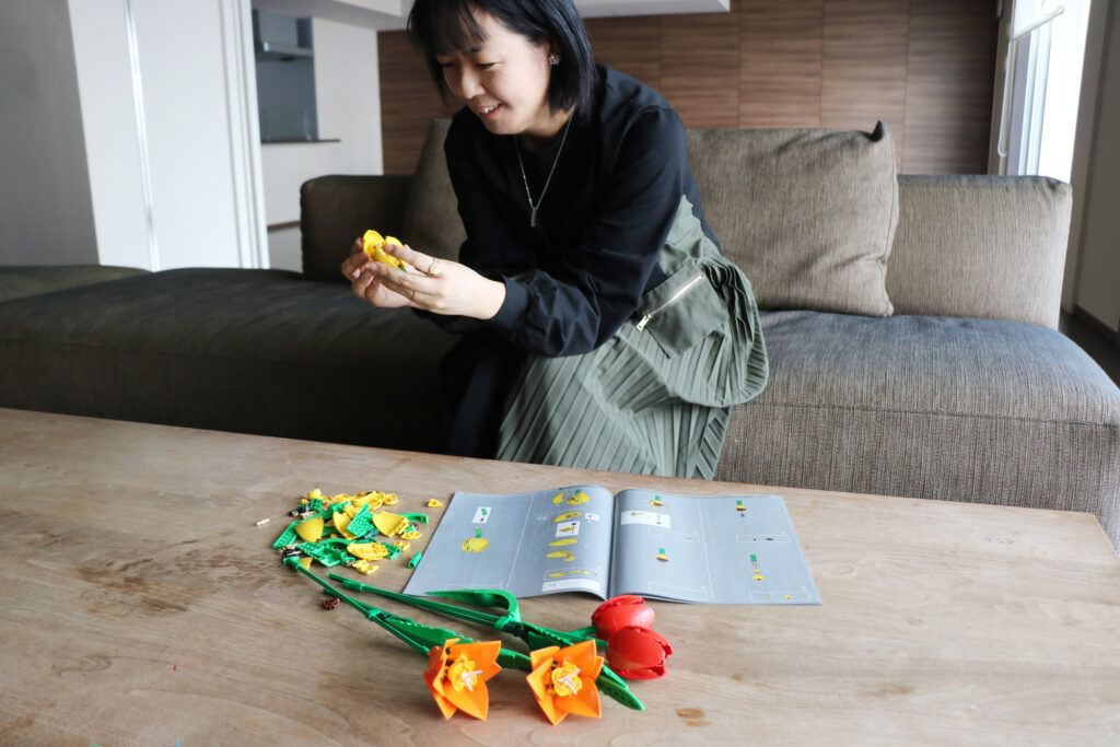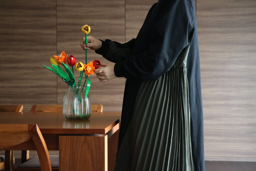 かわいい〜!自分で手作りしたという時間も込みで、達成感がすごかったです(笑)。近くで見てもかわいい!お客様が来た時にも、造花と見せかけて『えっ!これ、レゴ®️ブロックじゃん!』というサプライズ感もありますね。